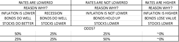 What do we know? Interest rates will either be higher, lower, or at the current level. From here on, things get fuzzy. Let’s assume how bonds and stocks might react to each scenario. The chances of higher interest rates are slim but not zero, and that is good news. If rates move higher, this is bad for both stocks and bonds.